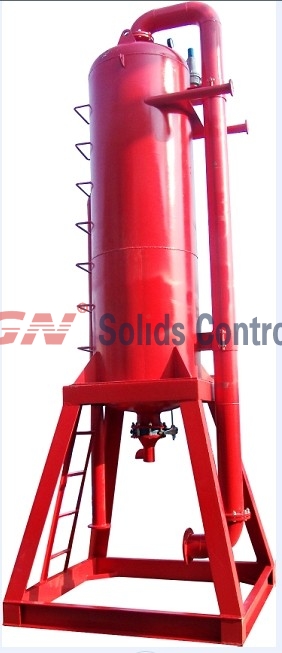 型號 罐體直徑 處理量 進口尺寸 出口尺寸 排氣管尺寸 重量 外形尺寸(mm) GNZYQ1000A 1000mm 200~280m3/h 4″ 10″ 8″ 2411kg 2265×2000×5681 以上參數僅供參考! GNZYQ1000A系列液氣分離器是一種很好的泥漿氣體分離器,氣浸鉆井液從分離器進液口切線進入分離器內,順內壁落在專門設計的一系列內擋板上,碰撞,增大暴露表面積,向下流動,造成紊流狀態,使氣體與鉆井液分離。游離氣體通過灌頂的氣體出口排出,排氣管長度由現場確定及配套,并引到安全處,而脫氣后的鉆井液排入循環罐。