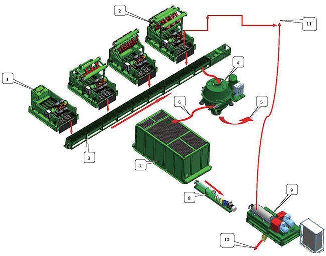鉆井泥漿不落地處理工作流程說(shuō)明如下:鉆機(jī)過(guò)來(lái)的泥漿通過(guò)高架管匯進(jìn)入振動(dòng)篩(1)、清潔器(2),經(jīng)過(guò)(1)、(2) 處理排放的鉆屑通過(guò)螺旋輸送器(3)輸送至立式甩干機(jī)處理(4)。立式甩干機(jī)處理完的固體通過(guò)廢渣(5) 排除,回收到的鉆井泥漿(6)進(jìn)入鉆井液泥漿罐體(7),離心機(jī)供液泵或螺桿泵(8)抽取含有細(xì)固 顆粒的回收泥漿,供給離心機(jī)(9 )處理,固體部分通過(guò)固體排渣口(10)排除,處理完成的鉆井液通 過(guò)干凈泥漿回歸泥漿系統(tǒng)(11)。