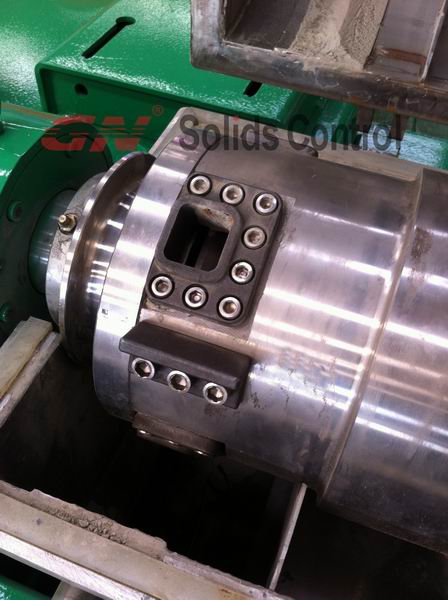 2,一臺電動機帶動轉鼓和螺旋推進器,通過皮帶輪和電動機皮帶驅動轉鼓,齒輪單元的設計,使螺旋的輸入速度比轉鼓低得多,螺旋的動力同樣來自于同一臺電機,因此差轉速的存在保證了離心機工作可用性。