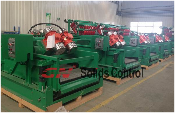 500gpm泥漿系統包括以下項目: 1)一臺500gpm處理量的鉆井液振動篩:GNZS703E-DZ。該振動篩采用箱式供料,方便水井鉆機工作,3片篩網都采用加楔塊式安裝裝置,便于篩網快速更換。 2)一臺500gpm處理量的泥漿清潔器:GNZJ703E-1S8N。該款泥漿清潔器同樣采用GNZS703E-DZ振動篩,3片篩網都采用楔塊式安裝裝置,便于篩網快速更換;篩箱底框采用不銹鋼材質延長使用壽命。 3)一臺泥漿攪拌器。泥漿攪拌器安裝在干凈泥漿儲漿罐中,在添加化學添加劑后起到懸浮泥漿和混合泥漿的作用。 4)一臺雙離心泵的射流混漿裝置。一個泵從泥漿罐到料斗起到循環泥漿的作用,混合添加化學物質,另一個將泥漿泵到鉆井平臺。與此同時,國內客戶的兩套用于HDD非開挖項目的1500gpm的泥漿系統也準備交付。